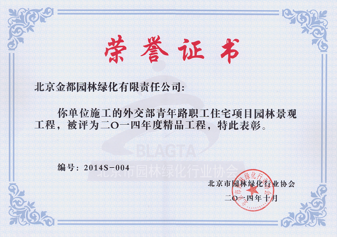 外交部青年路職工住宅項目園林景觀工程,工程造價:1388萬元,工程總面積:28000平米,其中綠地面積:18000平米,鋪裝面積:10000平米,開工時間:2013年3月1日,竣工時間2013年10月23日。該項目榮獲2014年度北京市優(yōu)質工程獎。