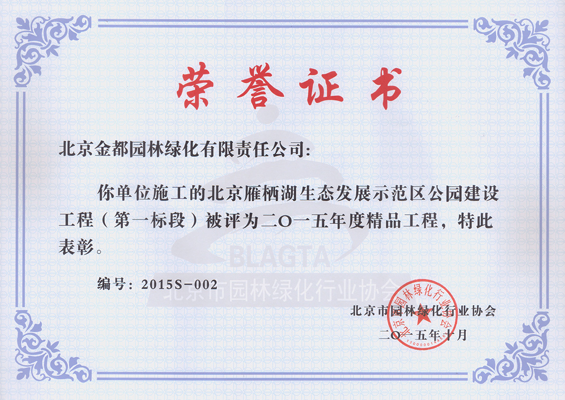 北京雁棲湖生態發展示范區公園建設工程(第一標段),開工時間:2014年3月15日,竣工時間:2015年6月16日。