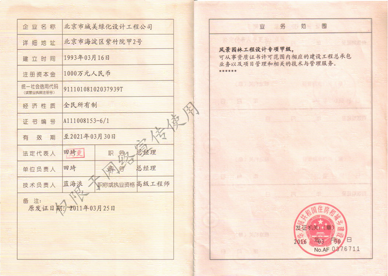 北京市城美綠化設計工程有限公司,成立于1993年3月,隸屬于北京金都園林綠化有限責任公司,目前具有風景園林工程設計專項甲級資質和園林綠化施工貳級資質。