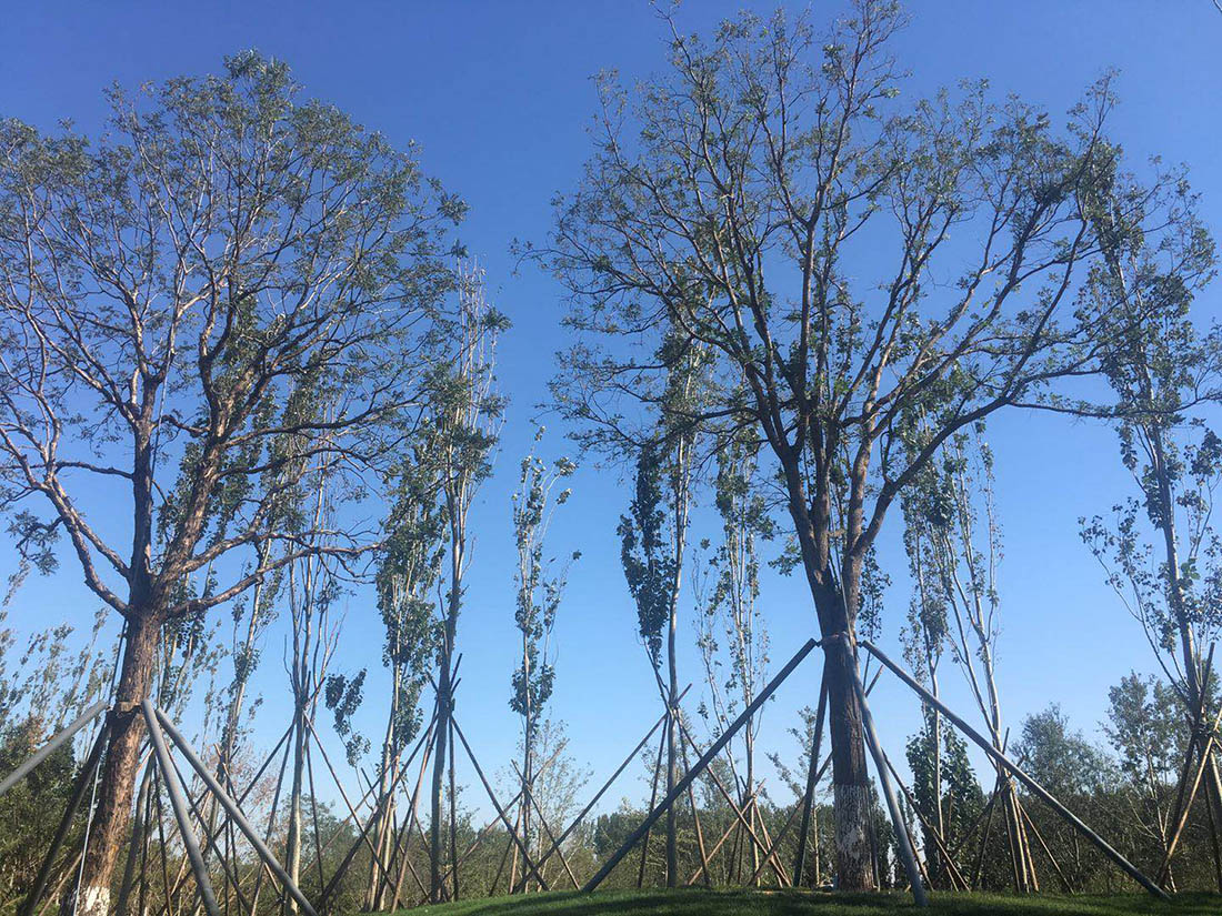 依托金都公司幾十多年的大樹移植現場施工經驗,形成了一套集苗木打包改良技術、穴土改良技術、滲透式雨水管、通氣滲灌系統、新型土壤透氣管、隱形樹木支撐架、雙層圍堰結構、藥劑處理等措施為一體的大規格苗木移植保活技術體系,確保實現大規格苗木全冠移植后能活力快速恢復生長狀態。